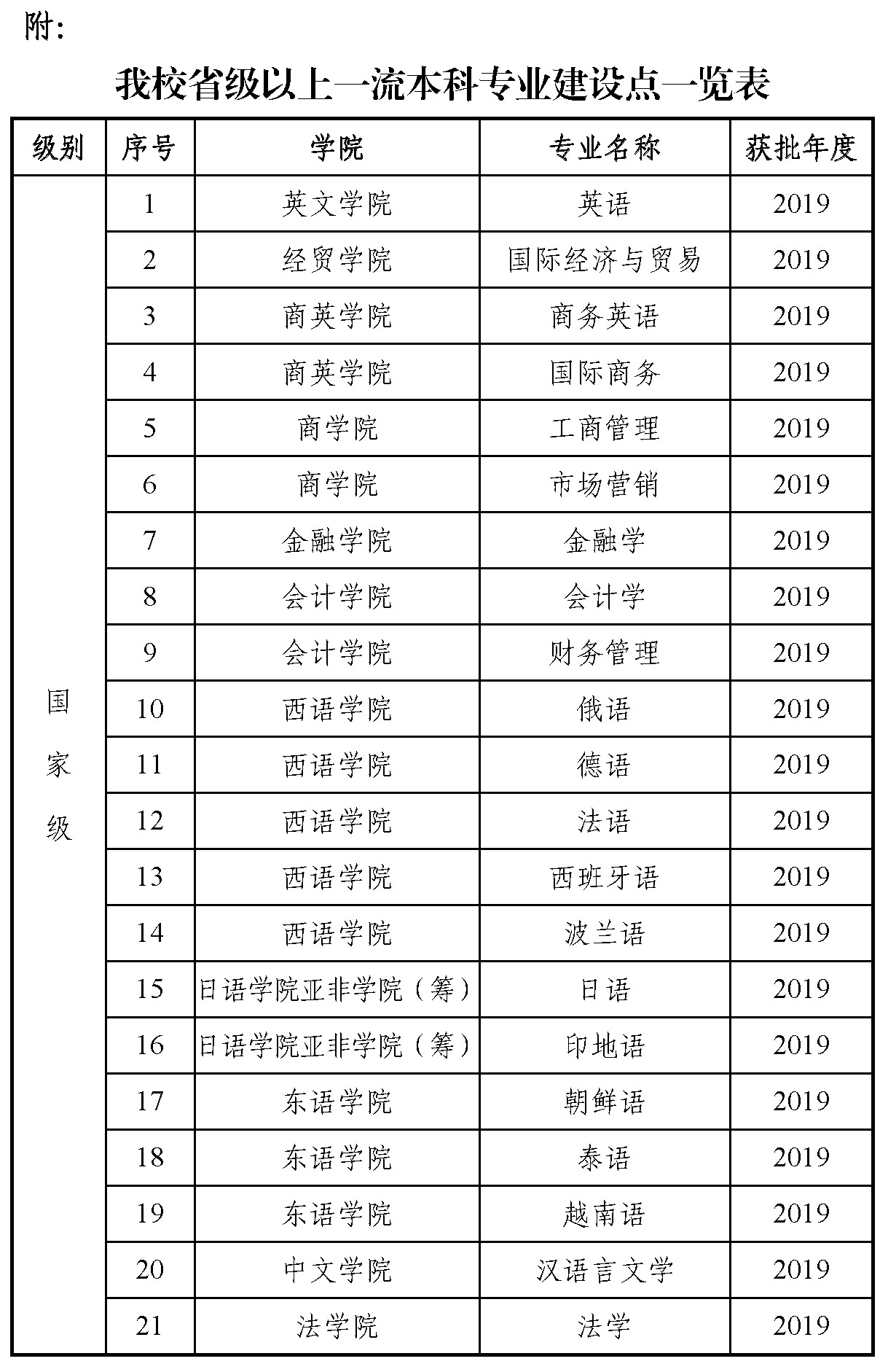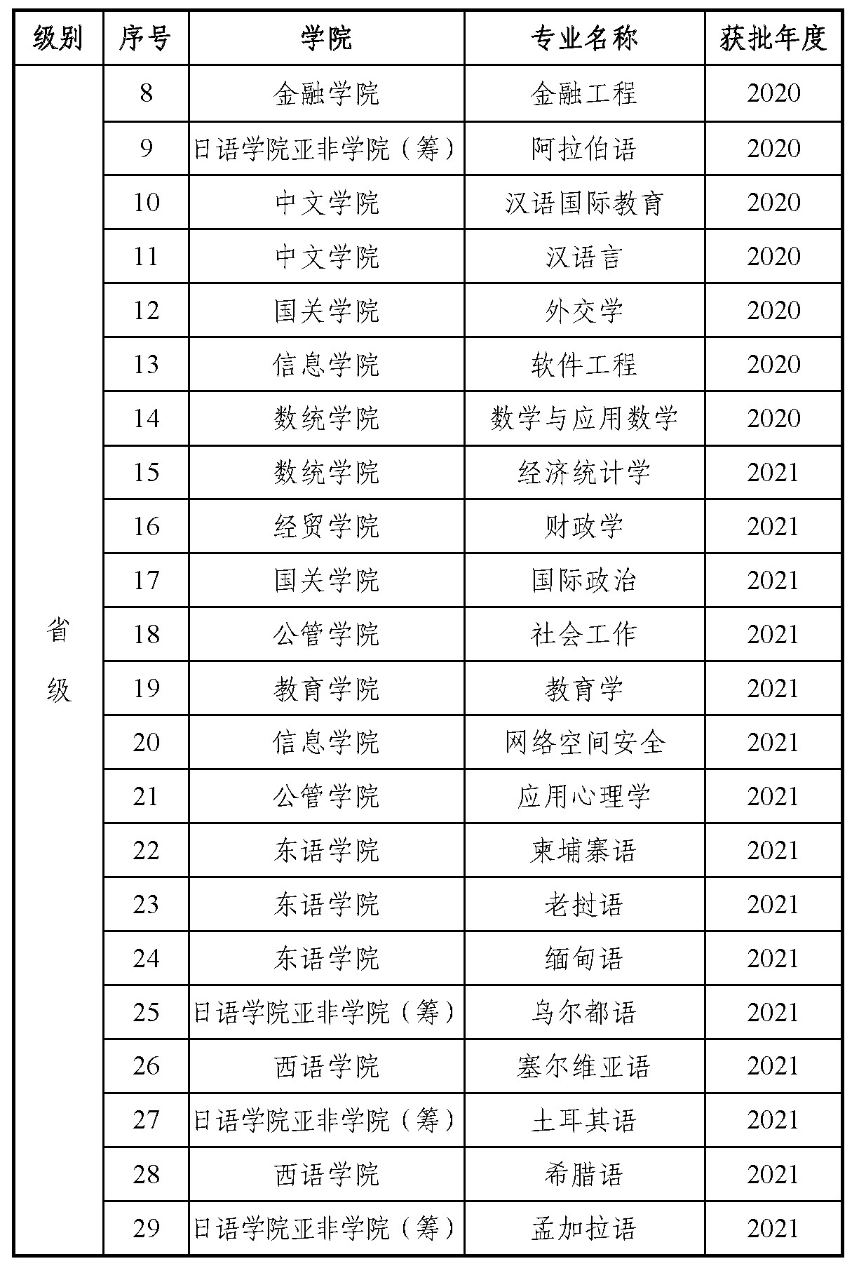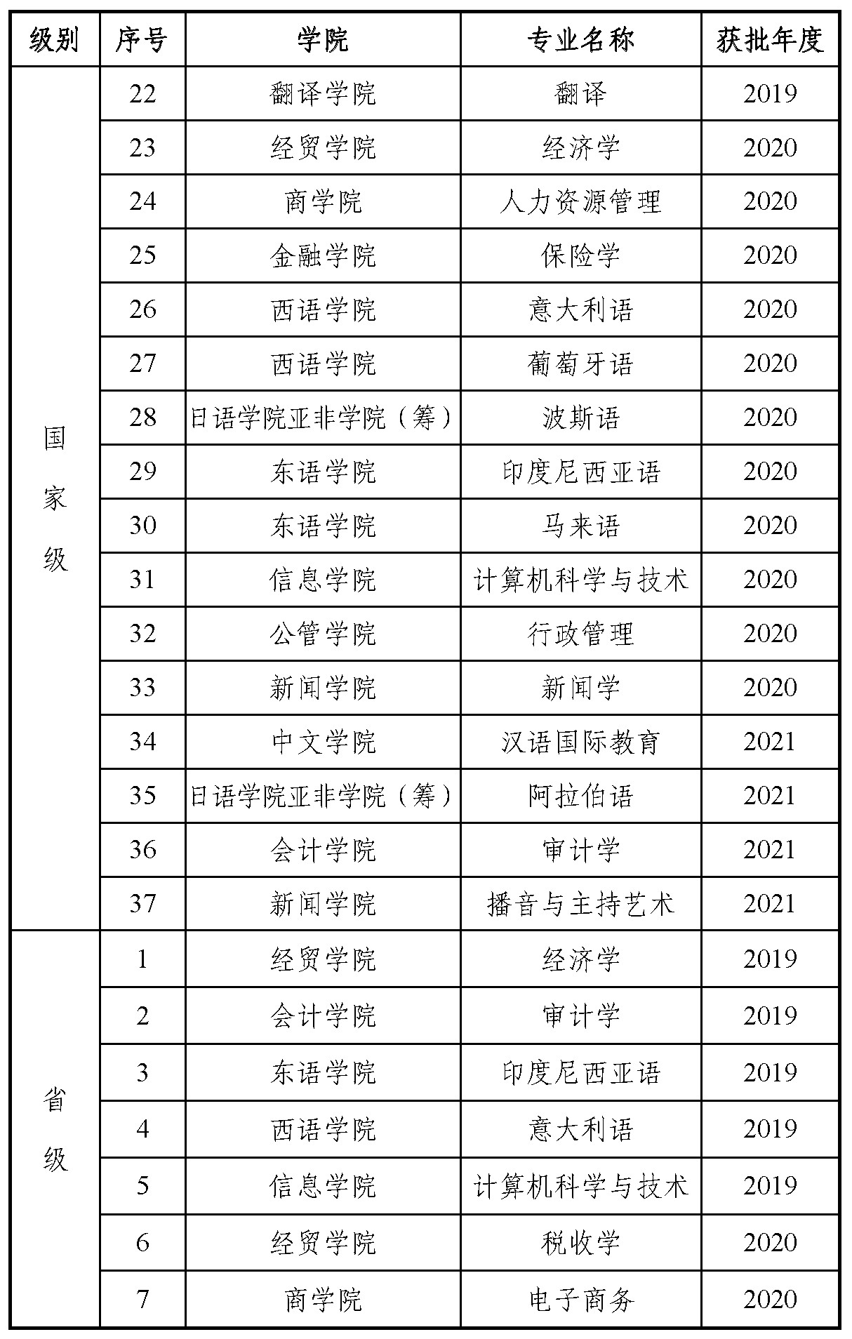 近日,根据《教育部办公厅关于公布2021年度国家级和省级一流本科专业建设点名单的通知》,我校汉语国际教育、阿拉伯语、审计学和播音与主持艺术4个专业获批国家级一流本科专业建设点,经济统计学、财政学、国际政治、社会工作、教育学、网络空间安全、应用心理学、柬埔寨语、老挝语、缅甸语、乌尔都语、塞尔维亚语、土耳其语、希腊语和孟加拉语共15个专业获批广东省一流本科专业建设点,一流本科专业建设点建设连续三年获得重大突破。截至目前,我校共获批国家级一流本科专业建设点37个,在68个本科招生专业中占比超过一半(54%);获批省级以上一流本科专业建设点59个,占招生专业总数近九成(87%)。