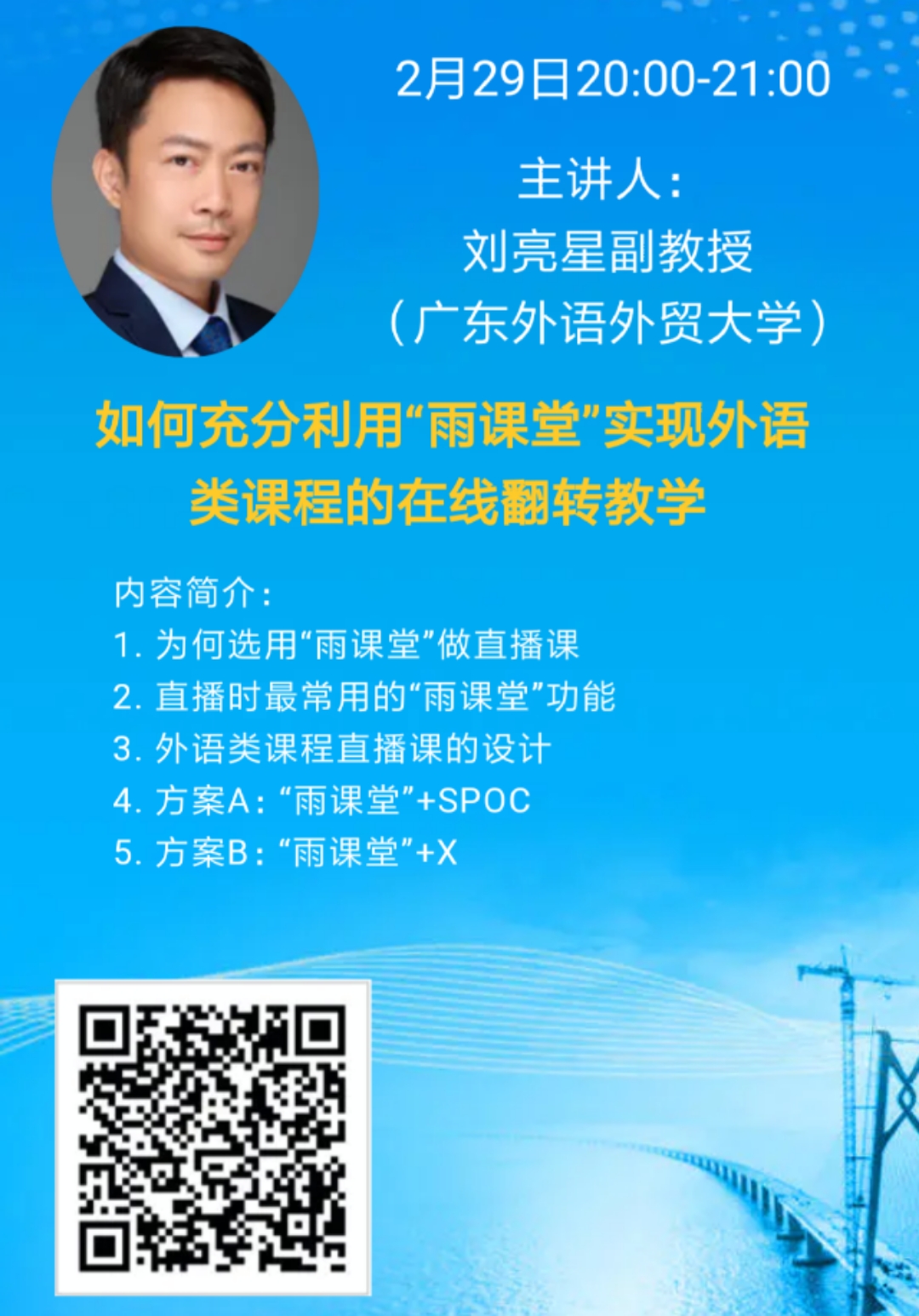 为共抗疫情,支持和配合各高校教师在MOOC平台顺利开展线上教学,粤港澳大湾区高校在线开放课程联盟联合各大平台,邀请使用相关MOOC平台的优秀教师,免费向高校推出第一期高校在线教学案例分享公益课。我校英语教育学院刘亮星老师受邀将于2月29日20:00-21:00作题为《如何充分利用“雨课堂”实现外语类课程的在线翻转教学》的案例分析。