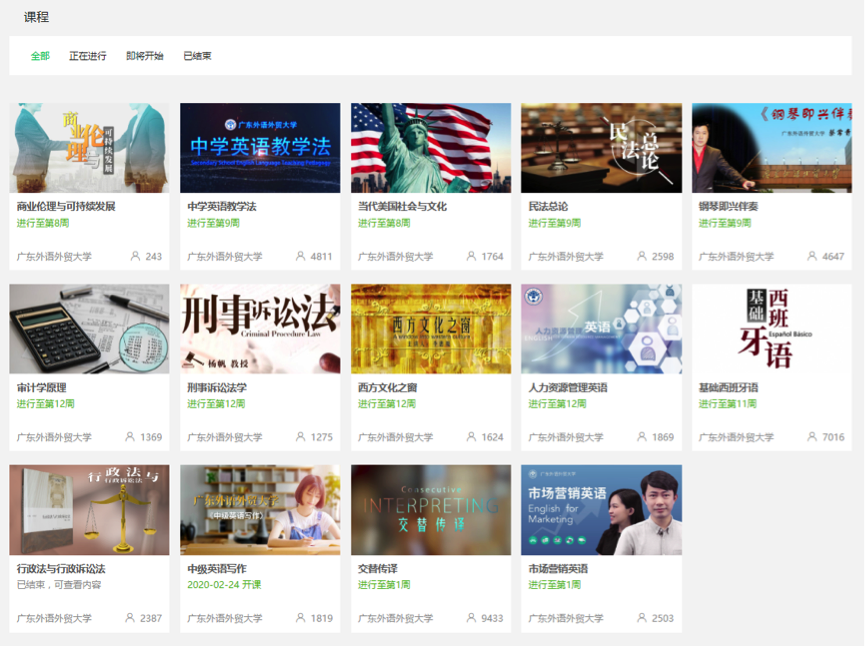 疫情当前,广东外语外贸大学为积极响应教育部“停课不停教,停课不停学”的工作要求,在多个平台免费向社会公众及高校师生开放我校优质课程资源(含虚拟仿真实验项目)共计34门次(18门)。其中含2门广东省精品在线开放课程、8门广东省在线开放课程、4门广东省系列在线开放课程。