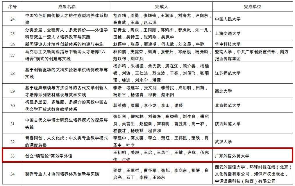 日前,教育部下发了《关于批准2018年国家级教学成果奖获奖项目的决定》(教师〔2018〕21号),公布了2018年国家级教学成果奖评审结果。我校王初明教授主持,姜琳、王启、王凤兰、王敏、许琪、伍志伟、洪炜等人参与的“创立‘续理论’高效学外语”项目获得国家级教学成果奖二等奖。