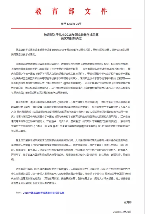 高等教育国家级教学成果奖是国务院确定的国家级奖励,每4年评选一次,是专门针对高等教育教学领域的最高表彰,被视为与国家自然科学奖、国家技术发明奖、国家科技进步奖并列的奖励项目,也是高校办学质量评价、学科评估、研究生学位点申报等重要工作的权威指标。高等教育国家级教学成果奖励评审坚持标准、质量第一,宁缺毋滥,允许各个等级奖项有空缺。2018年国家级高等教育教学成果奖分别设置特等奖2项、一等奖50项、二等奖400项,总计452项,其中广东省高校共获得31项。本次国家级教学成果奖获奖是我校自2005年以来再次获此殊荣,也是我校近年来深化教学改革、鼓励科教融合的成果彰显。学校和获奖单位及个人,将继续做好成果的创新发展和应用推广,充分发挥成果的辐射与示范作用,助力提升人才培养质量。