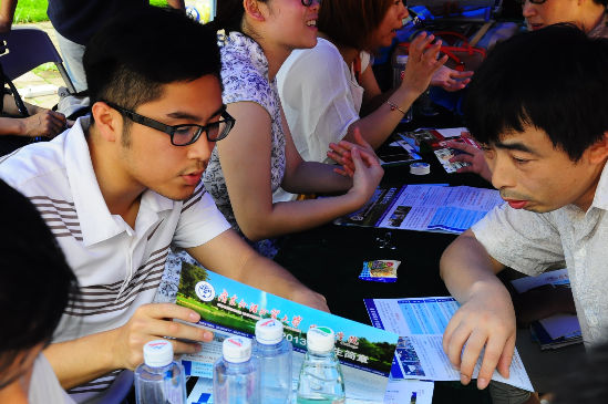 上午9时, 19个学院的摊位正式开放咨询。每个学院都使出招式吸引来客的眼球:中文学院的学生身着汉服,翩翩成仙;法学院的宣传员头顶披肩假发,一身法官长袍;更有泰语系的同学巧手制作泰国甜点、艺术学院出动美女阵营……学生和家长们或在展板下阅读专业信息,或在摊位前向老师咨询报考知识,虽然烈日炎炎,学生和家长却热情不减,场面十分火爆。
