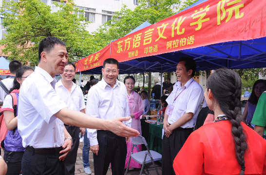 仲伟合除了关注招生宣传工作的情况,对担任宣传员的学生也十分关心。来到印地语专业的摊位前,仲伟合对该专业的学生说:“中印两国的交流日益频繁,希望你们能好好学习,将来会有你们的用武之地!”而面对中文学院身着汉服的同学,仲伟合笑道:“服饰可以复古,但思想不能复古。”
