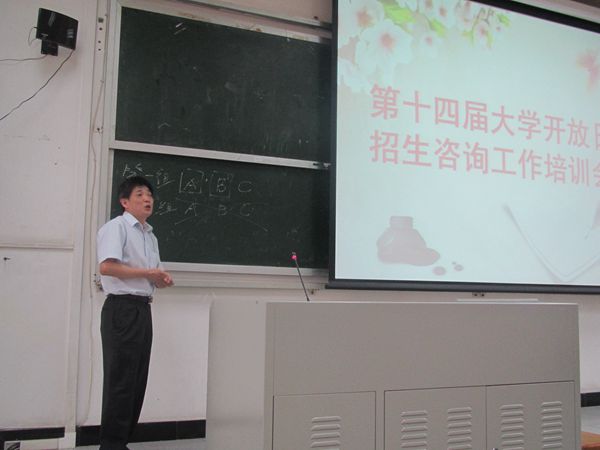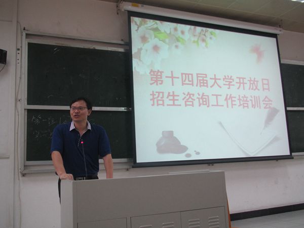 教务处处长、招生办主任詹文都对开放日参与招生咨询的工作人员进行了培训。詹文都首先对各学院(部门)和各位老师一直以来对招生工作的大力支持表示感谢。詹文都指出,今年我校的招生宣传工作面临的形势十分严峻,希望参与招生咨询的工作人员一定要明确形势,认真参加培训。接下来,詹文都就我校今年的招生宣传规划、广东省平行志愿投档模式和我校今年的招生政策做了详细的介绍。