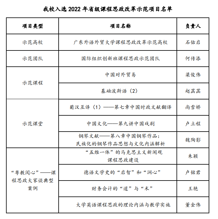 近日,广东省教育厅公布了《关于公布2022年度本科高校课程思政改革示范项目认定名单的通知》,我校入选2022年广东省课程思政改革示范高校。同时,我校推荐的《国际组织创新班课程思政示范团队》等10个项目获批2022年省级课程思政改革示范项目,其中示范团队1个、示范课程2个、示范课堂3个、“粤教阅心”——课程思政大家谈典型案例4个。