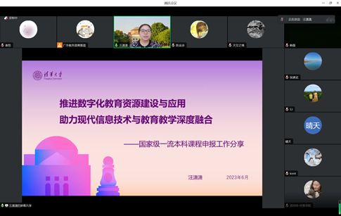 汪潇潇主任立足高等教育数字化转型的背景,全面解读了《“双万计划”国家级一流本科课程推荐认定办法》,同时展示线上一流课程及线上线下混合式一流课程的申报案例,详细解读了申报案例的填写逻辑和展示策略,并对申报书的填写规范和具体要求作了充分说明。会后,汪潇潇主任与参加培训的教师进行了热烈的讨论和交流。