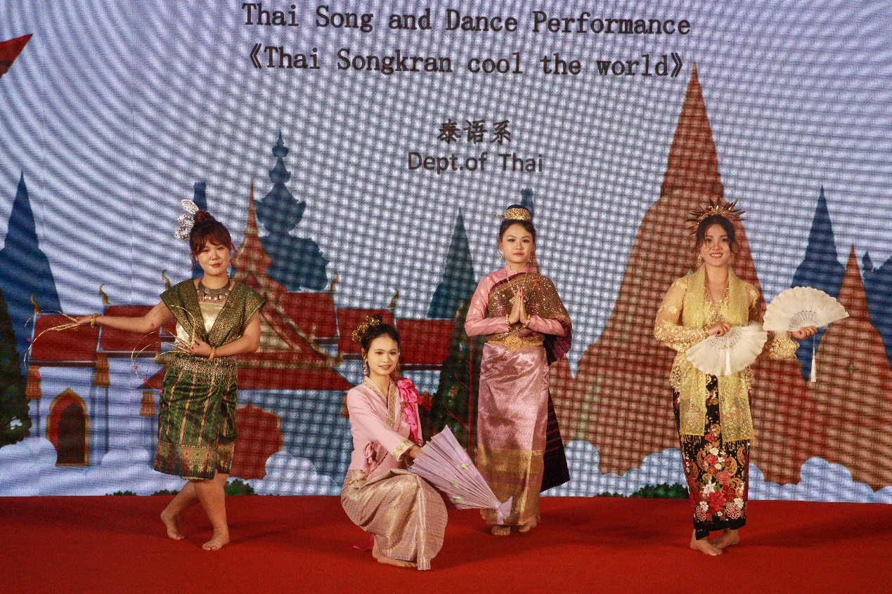 东方语言文化学院各语系精心准备的节目赢得了观众们的一致好评。各语系节目精彩纷呈,展示了各自文化的独特魅力,让观众领略到不同国家的风土人情。东语学院昂格隆乐队带来的昂格隆乐器演奏《美丽的梭罗河》将现场观众带入了那片古老而神秘的土地。昂格隆乐器深沉而悠扬的旋律,犹如梭罗河的涓涓流水,讲述着流传千古的传奇故事。泰语系舞蹈《盛放·宋干》,舞者们身着泰式的服饰,以轻盈的舞姿和欢快的节奏,展现了泰国人民在节日里的喜悦与欢庆。越南语系舞蹈《YêuNắm(紧握爱)》青春与活力交织,激昂音乐与动感舞姿相得益彰,舞者们以轻盈舞步诠释青春激情。