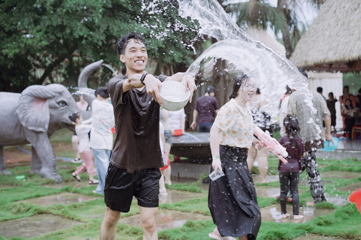 在午后阳光下,泰国馆外的泼水节活动热闹非凡,吸引了参与者。学生们身着传统服饰,与参与者们一同欢快起舞,尽情享受这独特的东南亚风情。泼水广场上,欢声笑语如潮水般涌动,大家用水花传递着对彼此最美好的祝愿和期许 。