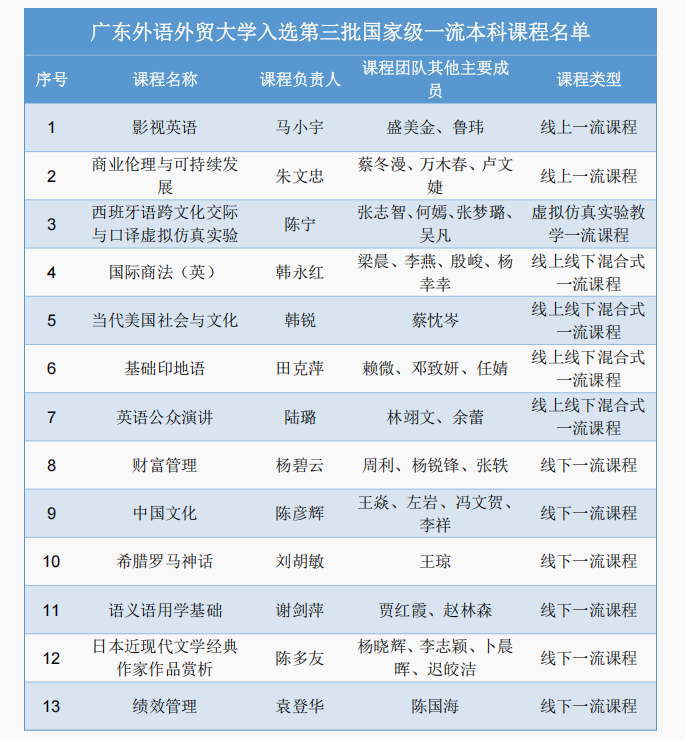近年来,学校立足广外特色,结合一流本科专业建设,丰富优质课程资源,扎实开展一流本科课程建设,提升课程的高阶性、创新性与挑战度,以一流课程建设带动全校本科课程建设,全面提升本科课堂教学质量与育人实效。面向未来,学校将持续深化一流本科课程建设成果,促进数智技术与课堂教学的融合创新,推进优质教育资源共建共享,为学校本科教育高质量发展和育人能力全面提升提供坚实支撑。