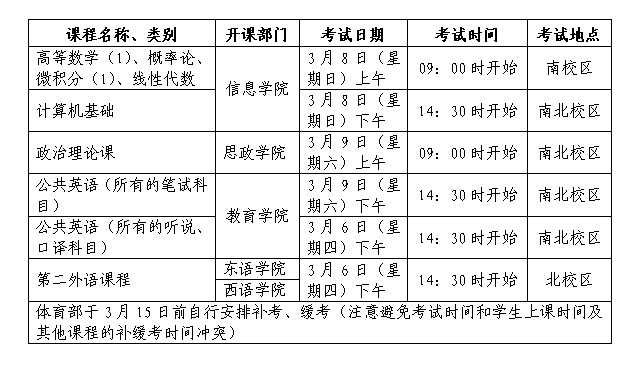 由思政学院、教育学院、信息学院开设的公共课程的补考、缓考安排在南北校区同时进行;由东语学院、西语学院开设的第二外语课程的补考、缓考安排在北校区进行。总体安排见下表: