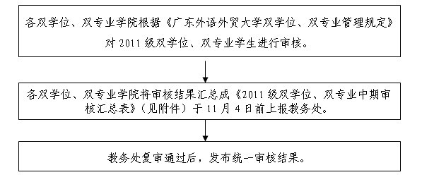 2011级双学位、双专业中期审核工作即将开始,根据《广东外语外贸大学本科双学位、双专业管理规定》(广外大教[2010]49号),现将有关事项通知如下: